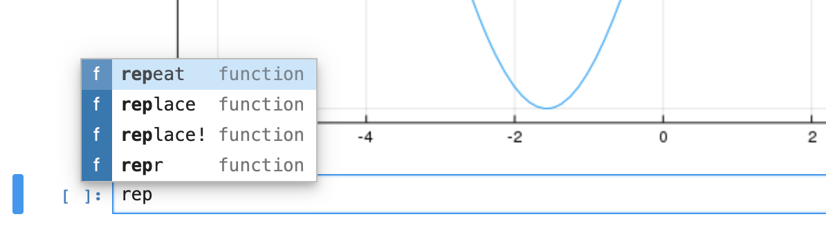 Tab completion in Jupyter makes it easy to find Julia commands and functions available.