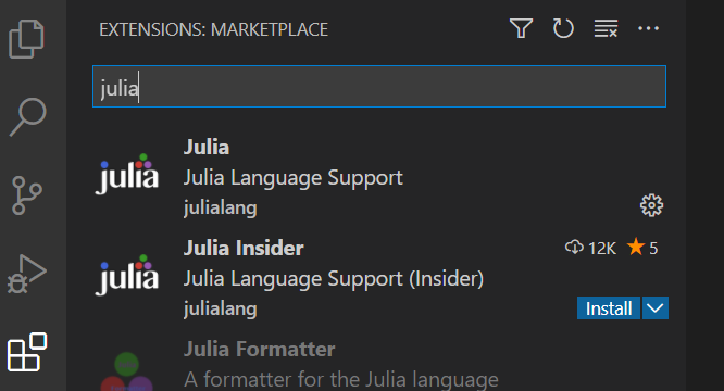 <Ctrl+Shift+X>or selecting extensions in the left-hand side of the VS Code window. Then search forJuliain the Marketplace.