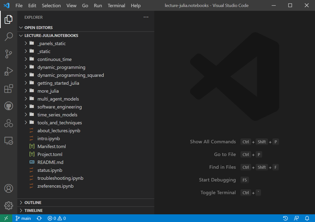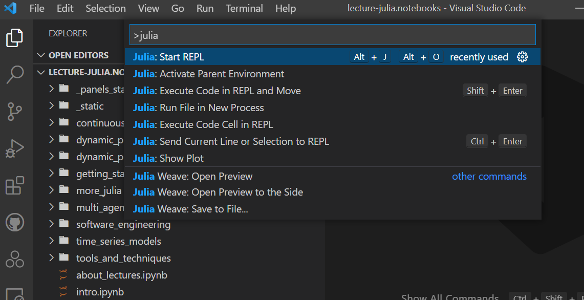 https://github.com/quantecon/lecture-julia.notebooksAlternatively, if you are already a user of Visual Studio Code, you can clone within VS Code by using the> Git: Clonecommand from the command palette. See the lectures on tools and source code control for more details.Choose the location to clone when prompted