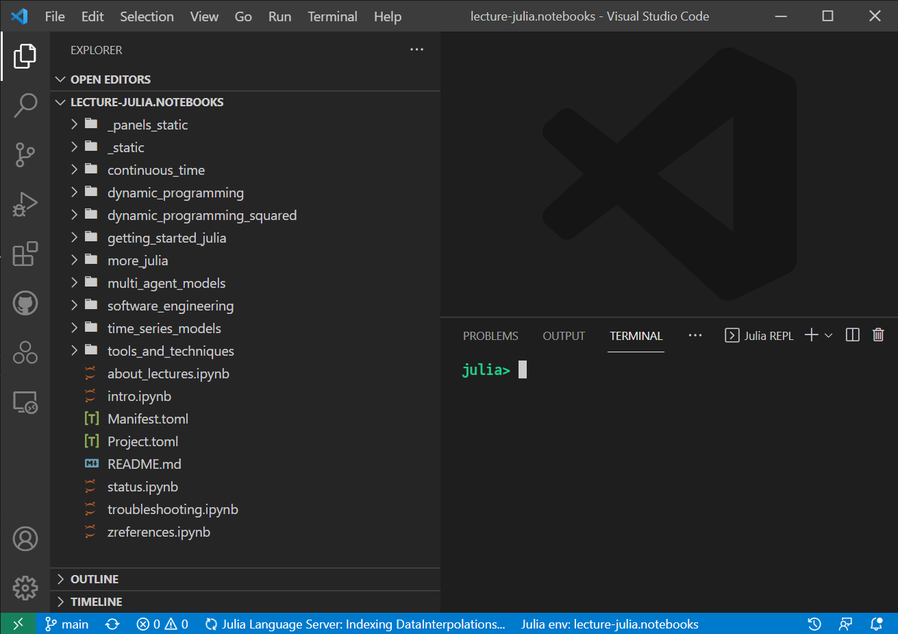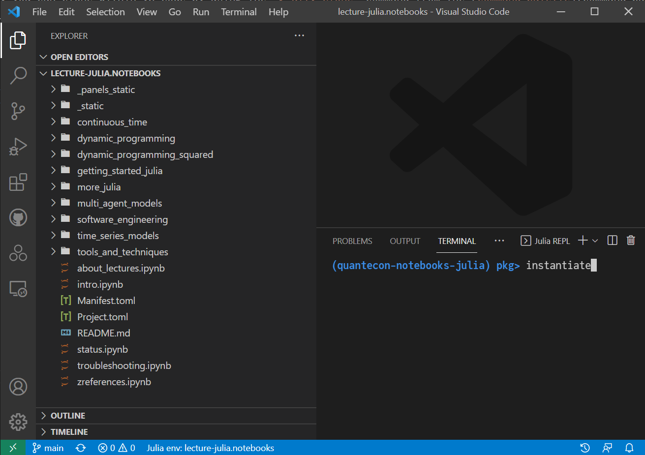 Alternatively, you can simply install Julia, VS Code, Git, and the Julia extension for VS Code and use the notebooks directly without an installation of Python.