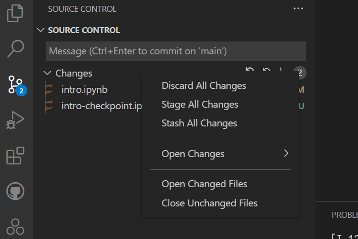 Additionally, if the notebooks themselves are modified as the lecture notes evolve, you can first discard any changes, and then either use > Git: Pull command or click on the arrow next to “main” on the bottom left of the screen to download the latest versions. Here “main” refers to the main branch of the repo where the latest versions are hosted.